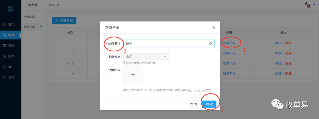 商品分类创建:【商品—商品分类—新建分类;新增下级—分类名称—确定】